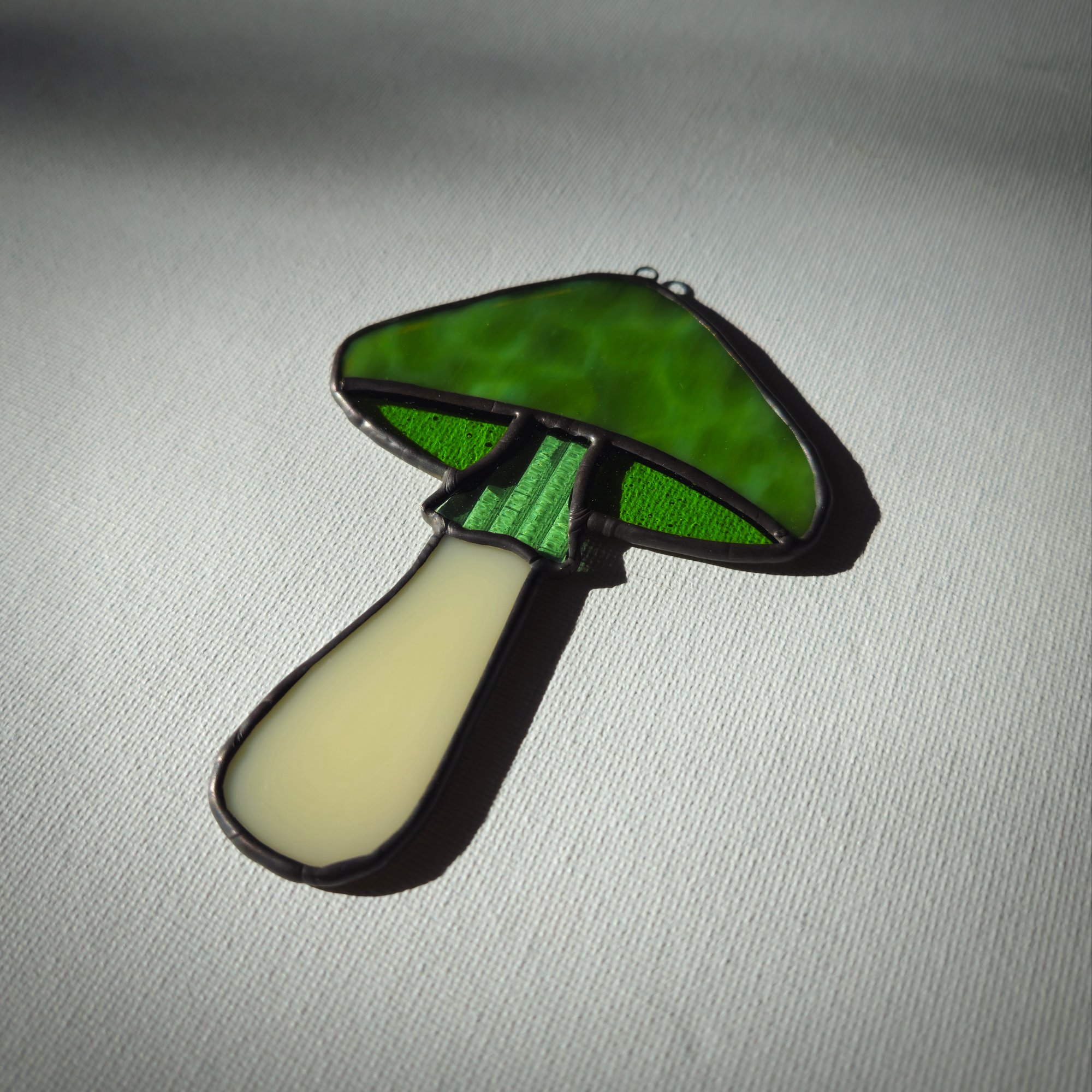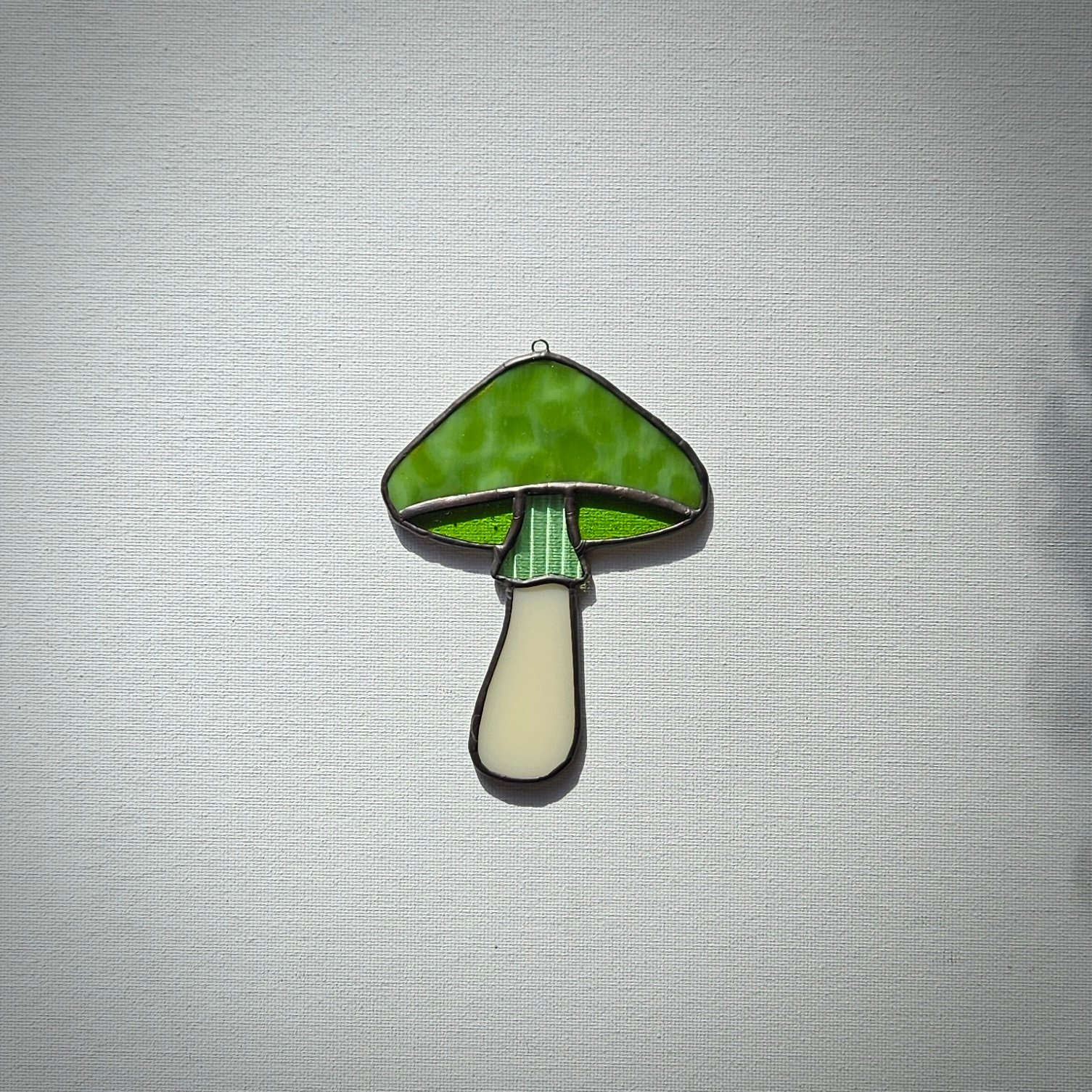 Bring woodland charm into your space with this handcrafted green stained glass mushroom suncatcher. Made with vibrant textured glass, this whimsical mushroom adds a pop of color to windows, gallery walls, plant shelves, or cottage core décor. A unique art glass accent for nature lovers, fungi fans, and anyone who loves quirky, colorful home décor. Perfect as a gift for plant parents, boho décor lovers, or collectors of stained glass art.